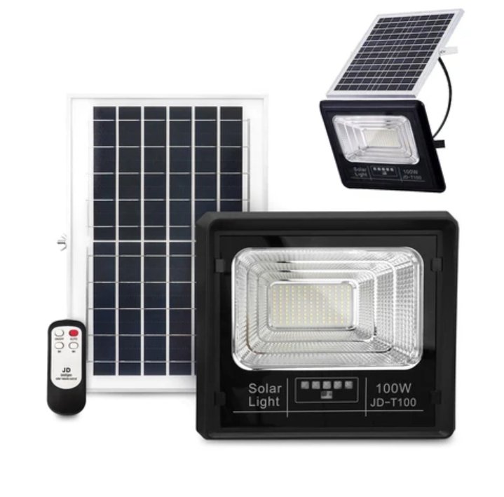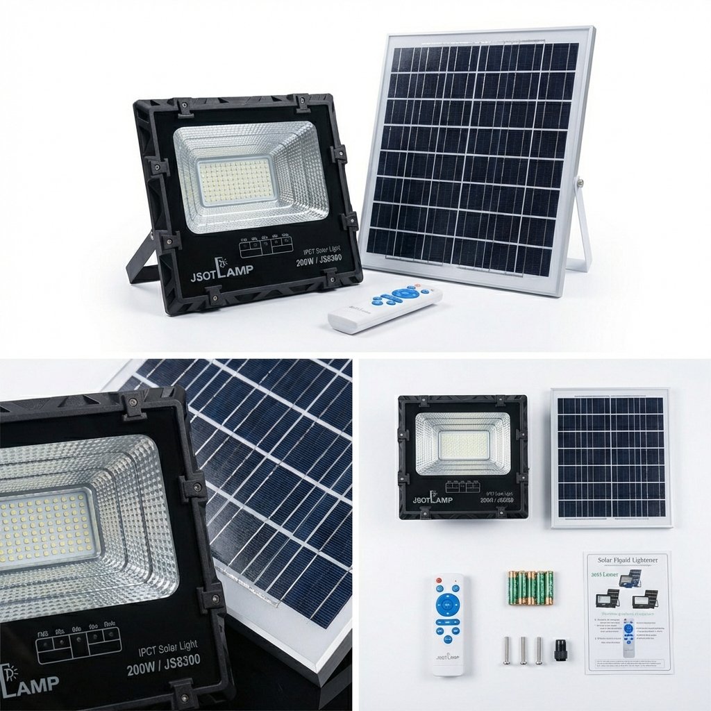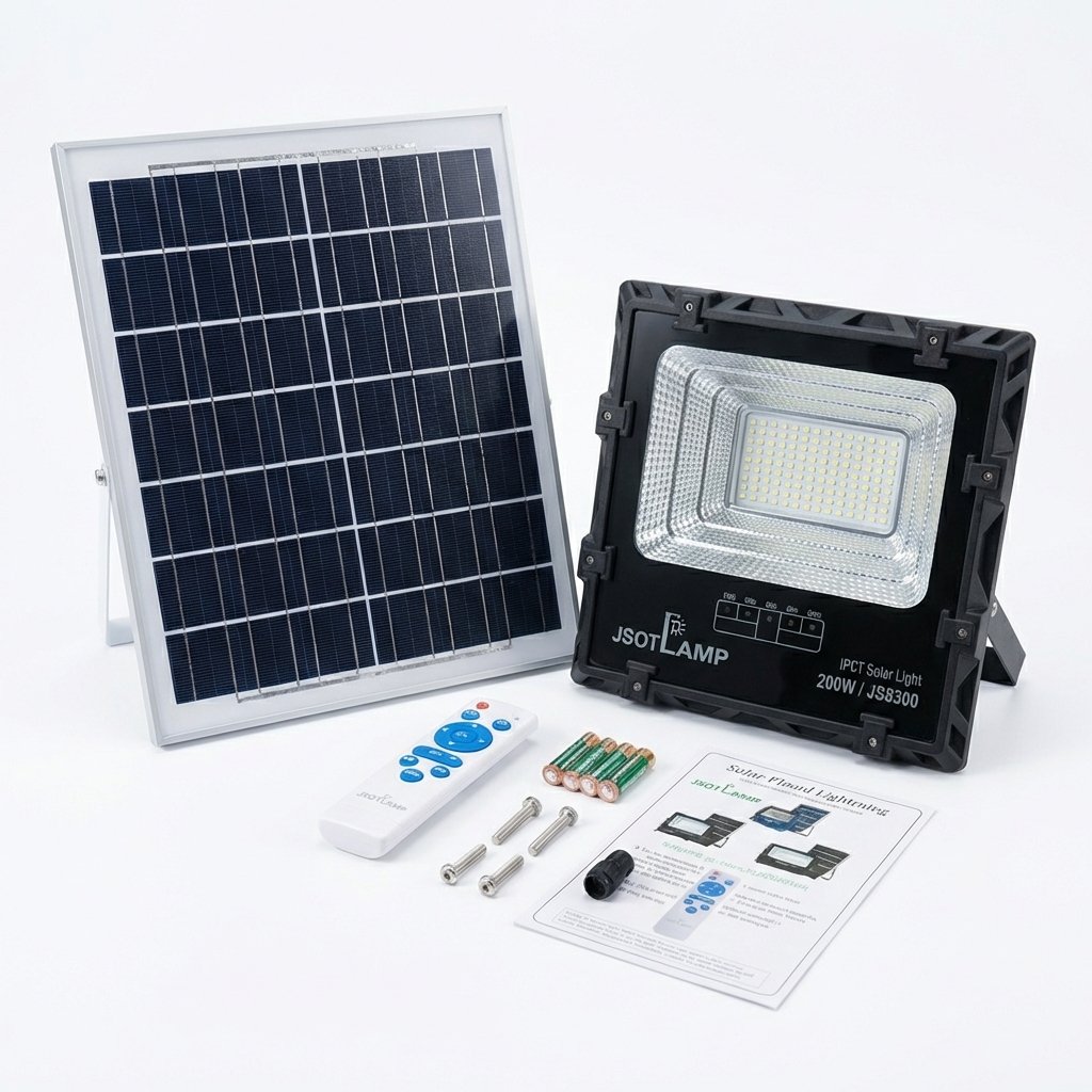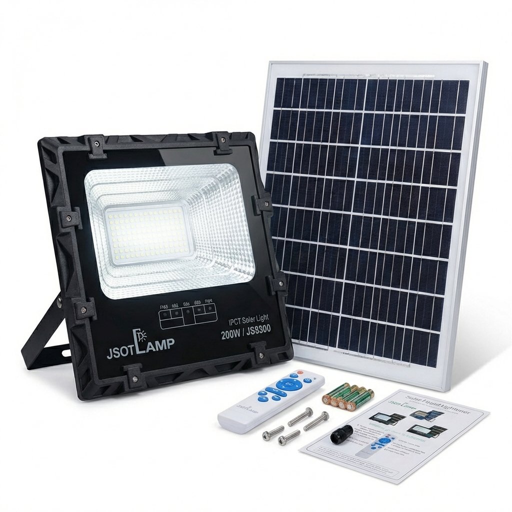 JSOT IPCT Solar Flood Light series, available in 100W, 200W, and 300W options, providing a high-efficiency and eco-friendly solution for outdoor illumination and security. This system operates off-grid, utilizing a separate solar panel to eliminate electricity costs and complex wiring.
